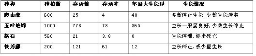 从表2 所示五叶地锦,落叶木质藤本。7~8月开花,果期9~10月。其光照适应性极好,在多种光照条件下均可生长。既耐寒,又耐热,耐贫瘠、干旱,耐荫、抗性强,生长势旺盛,春夏碧绿可人,入秋后红叶色彩可观,如入冬后疏理枯枝,早春施以薄肥,可促进枝繁叶茂。在上海高架路立地条件下应是较为理想的种植材料。