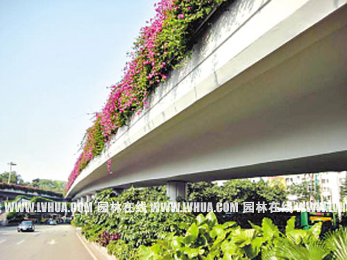 在高架道路的绿化设计、绿化建设滞后于桥梁道路设计施工的现状下, 要实施绿化建设, 在高架道路的两侧种上绿色植物, 以形成绿色长廊, 困难重重。