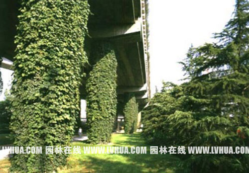 桥面绿化和立柱的绿化,这二部分形式都是垂直绿化,并且有鲜明的自身特点:首先它的地理位置特殊,都位于主要的城市道口,是进入市区的必经之路;其次立地条件差,土壤板结、浇水困难、汽车废气和粉尘污染、部分位置光线严重不足,这些条件制约着植物的正常生长。而垂直绿化以弥补地面绿化的不足,能在不增加城市用地的情况下,扩大城市的绿化范围,提高绿化覆盖率。经研究测定,在炎热的夏季,有爬山虎覆盖的墙面比裸露的墙面表面温度要低3℃至5℃,还能吸收大气污染物、缓解城市热岛效应的功能。而且,藤蔓类植物生长速度快,两到三年即可形成绿荫满壁、枝繁叶茂的景观。