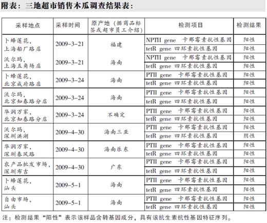 绿色和平组织今年3~5月,分别对沃尔玛超市的北京知春路店、上海五角场店、深圳洪湖店以及易初莲花(易初莲花店正陆续更名为卜蜂莲花)北京成府路店、深圳布吉农产品市场等地销售,标注原产地为海南、广东、菲律宾的木瓜进行抽查。送往国家认可的权威检测机构进行检查,结果显示,除了沃尔玛北京知春路店所销售的菲律宾进口木瓜为非转基因木瓜外,绿色和平在上述城市的超市买到的国产木瓜无一例外全是转基因品种。