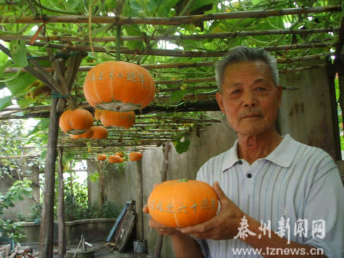 靖江73岁的洪士兴爱好栽种“艺术南瓜”,并将其馈赠给亲朋好友、左邻右舍。今年,老人家栽种的“艺术南瓜”上刻有“庆祝中华人民共和国成立60周年”,人称“国庆南瓜”。