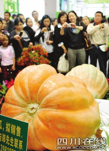 出身美国巨型南瓜家族,体重高达560斤——本届西博会上,一颗名为“睡美人”的巨型南瓜成为“2009年中国西部国际农产品交易会”展厅内的明星。农业专家称,这是目前川内产出的最大南瓜。目前已有商家开出6000元的高价,希望买下它。