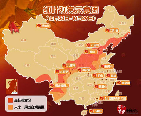 新农网讯 进入十月下旬,随着冷空气频繁造访,北京、河北、河南、四川、云南等地气温逐渐走低,早晚的温差也时刻提醒着人们天气渐寒。而此时的大自然,很多的植被也悄然换下了绿衣置上了暖暖的红色,北京香山、八达岭、四川九寨沟、米亚罗以及稻城俄初山等著名红叶景区将迎来今年红叶观赏的最佳时期。
