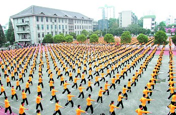长沙市明德中学的学生正利用课间操时间集体练习“太极拳”。重视学生的身体素质和全面发展为湖南教育界历来所关注,并已取得良好成效。