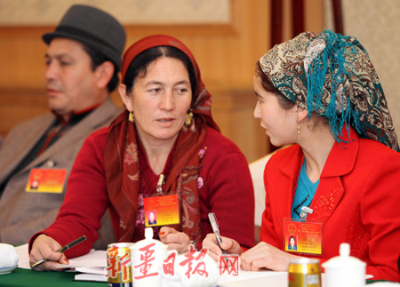 天山网讯(记者范浩摄影报道)1月16日,参加新疆维吾尔自治区十一届人大一次会议的和田地区代表沙拉买提汗·白地(中)和古丽巴哈尔·买吐地就加快和田地区农村医疗卫生事业展开讨论。