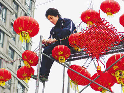摘要:1月15日上午,一位来自安徽的农民工正在浙江台州张挂红灯笼和中国结。现场一位安徽籍农民工说,近五六年来,他们就这样忙碌着在台州过新年,也挺快乐。