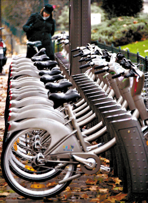 巴黎在各个社区免费提供自行车让市民和游客使用。(资料图片)