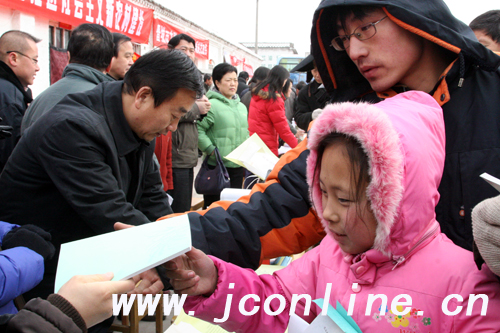 市农业技术推广站站长常忠沁说,我们来的时候带了很多图书书籍和宣传资料,一会儿就被老百姓抢光了。除了发放技术资料、赠送喜庆的对联、表演丰富的歌舞节目,服务队还专门把医疗点设在了老百姓的家门口,就近为村民们看病。虽然外面的气温已达到零下十几度,但是乡亲们的心里都是热乎乎的。