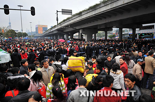 1月27日,广州火车站广场边的道路成为临时候车场,众多进不了候车室的旅客在这里候车。受恶劣天气影响,广州火车站大多数旅客列车晚点、停运,截至记者发稿时,广州火车站滞留旅客超过17万。新华社记者陈学思摄