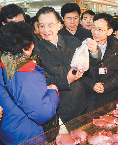 春节快到了,温家宝十分关心市场供应和价格问题。广州东川新街市农贸市场经营各类肉菜品种近万个,这里人流如潮,一派繁忙。来到店主梁少芬的档口,总理关切地问,咸水鸭一斤多少钱,在这里经营是否要交管理费。在店主周霞的档口,出售广州番禺区的无公害蔬菜,总理仔细查看产地。从菜价,到肉价,总理问得很细致。一位买菜的老太太告诉总理,今年她的退休工资又增加了160元,生活更有保障。温家宝听后高兴地笑了。冬雨中,总理与大家挥手告别。