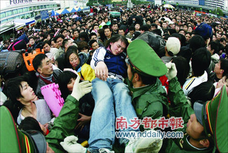 广州火车站广场,一位晕倒的旅客被接力式从等待进站的人群中送出,武警随后将她抬至正对着火车站进站大厅的临时医疗中心。本报记者张骏摄