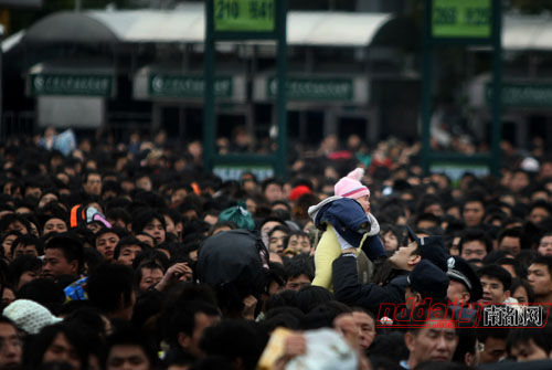 昨日部分列车恢复运行,大批乘客聚集在火车站广场外准备进站。一乘客晕倒在人群中,乘客把其抬高送进广场。实习生陈奕启本报记者方谦华
