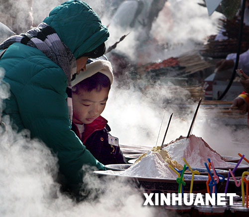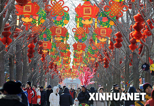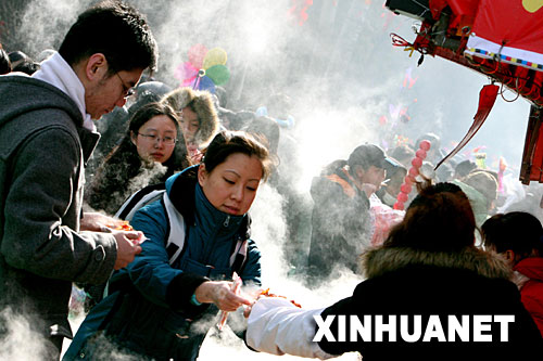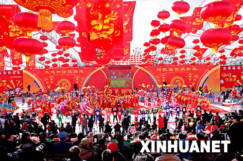 当日,第23届北京地坛春节文化庙会开幕。地坛庙会以地道民俗、传统民间特色闻名于京城。本届庙会突出“民俗韵、世界风、奥运情”3大元素,为游人营造出迎接奥运、欢度春节的喜庆氛围。 新华社发(张迺杰 摄)