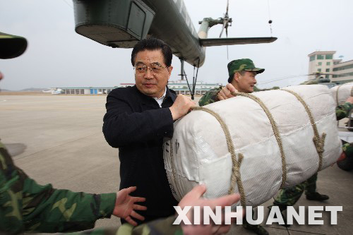 2月5日至6日,中共中央总书记、国家主席、中央军委主席胡锦涛来到广西桂林市考察抗灾救灾工作。这是胡锦涛同正在执行救灾任务的广州军区某集团军陆航团的官兵一起装运救灾物资。 新华社发