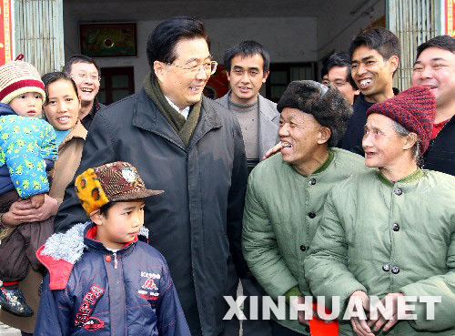 2月5日至6日,中共中央总书记、国家主席、中央军委主席胡锦涛来到广西桂林市考察抗灾救灾工作。这是胡锦涛在资源县中峰乡八坊村竹子水屯看望受灾村民。 新华社记者鞠鹏摄