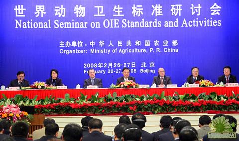 本网讯:2月26日,由农业部主办的世界动物卫生标准研讨会在北京举行。这是中国自2007年5月正式恢复在世界动物卫生组织(OIE)合法权利以来,首次举办世界动物卫生有关标准和规则研讨会,是近年来中国与OIE进一步深化交流与合作,加强国际重大动物疫病防控的一次重要活动。农业部副部长尹成杰、OIE主席巴里·奥尼尔、总干事伯纳德·瓦拉特出席研讨会并致辞。