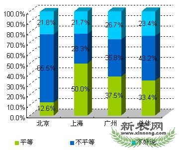 三地有33.4%的受访者认为求职当中女性与男性的地位平等,上海认为求职当中女性与男性的地位平等的比例最高,达到了一半(50%),其次是广州(37.5%),而北京认为求职当中女性与男性的地位平等的比例最低,仅为12.6%。另外,有23.4%的受访者对此问题没有明确的看法,三个城市持此看法的比例相差不大,其中广州略高(26.7%)。