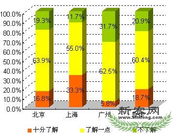 京沪穗三地的市民中,有60.4%的人对新的劳动合同法只了解一点,此类人群在北京、广州所占的比例较大,分别为63.9%、62.5%,上海的比例相对较少,只有55.0%。
