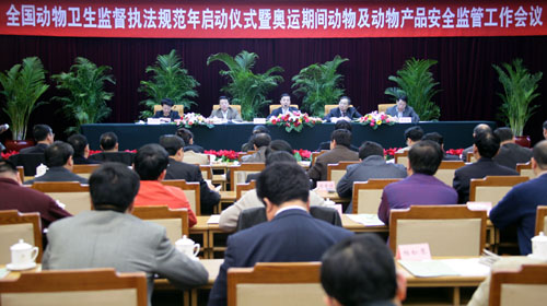 本网讯:3月28日,全国动物卫生监督执法规范年启动仪式暨奥运期间动物及动物产品安全监管工作会议在北京举行。农业部副部长尹成杰在讲话时强调,各级畜牧兽医部门要认真贯彻《中华人民共和国动物防疫法》等法律法规和党中央、国务院的决策部署,贯彻落实国务院“全国农业和粮食生产工作电视电话会议”精神,以科学发展观为指导,全面加强动物卫生监督执法工作,加大重大动物疫病防控和兽药残留监控力度。