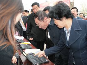 高鸿宾、张玉香在农业信息咨询台前仔细询问 |