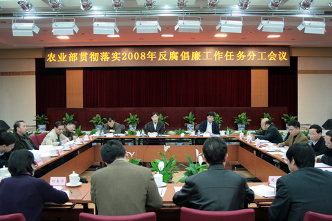本网讯:3月31日,农业部召开贯彻落实2008年反腐倡廉工作任务分工会议,对农业部反腐倡廉工作进行职责分工。农业部党组成员、驻部纪检组组长朱保成强调,抓好今年反腐倡廉任务的落实,必须紧紧抓住完善惩治和预防腐败体系这个重点,各单位要严格执行党风廉政建设责任制,切实加强领导,采取有力措施,确保各项分工任务顺利完成。