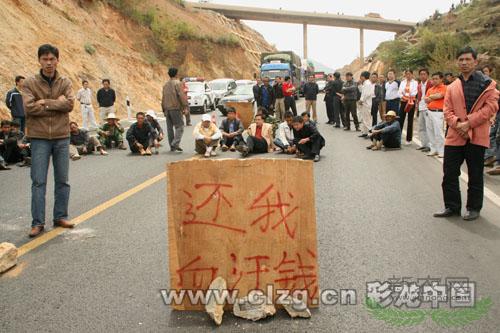 昨日12时40分,记者赶到现场时,堵塞车队已长达5公里,静坐现场围了许多人,还树起了“还我血汗钱”的大牌子,讨薪人员共有100余人。据了解,这些农民工全部为当地村民,他们参与修建昭待公路时欠的工程款没有结。农民工马某告诉记者,他们在工地上干了三年多,至今没有得到工钱,最少的几十元,最多有300多万元。他说,他们是走投无路了才做出了这样的举动。农民工龙某说,工程指挥部和劳动部门他们也都去过了,现在也没个结果。被堵的第一辆车的司机张先生着急地说他拉的是香蕉,要忙赶回西安,如果堵上两天的话,全部都坏了。昭阳区公安分局民警与昭阳区交警二大队交警先后赶到现场,对堵路农民工反复做思想工作,堵路农民工逐渐离开现场,于13时恢复正常通车。随后,记者随同一讨薪农民工到昭待公路某项目部,许多讨薪农民无奈地堵在门口,记者未遇见该项目部负责人,在记者离开现场前,该项目部的门一直都关闭着。
