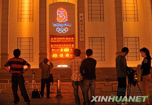 4月29日,游客在拍摄中国国家博物馆门前的2008年北京奥运会倒计时牌。当晚,北京迎来2008年北京奥运会倒计时100天。新华社记者罗晓光摄