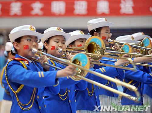 当日,“微笑北京――红领巾铿锵号角迎奥运”主题活动在石景山首钢篮球中心举行,少年儿童们以这种方式表达喜迎北京奥运会倒计时100天的热切心情。新华社记者罗晓光摄