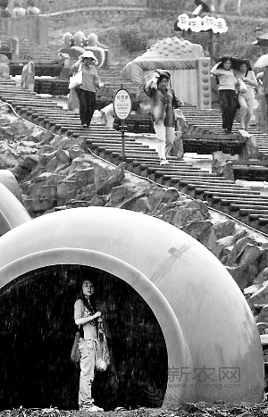 昨日,南滨路美心长江风景区,一位市民找到躲雨的好地方。一场暴雨结束了我市连续多日的闷热天气,气温也由30℃以上下降到24℃左右。