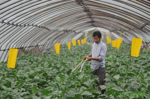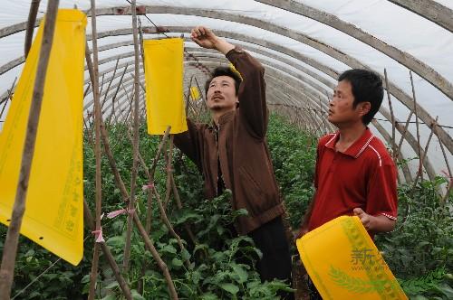 5月3日,农业技术人员(左)指导菜农悬挂黄色环保诱虫板。湖北宜昌市为了让市民吃上“放心菜”,派出农业技术人员指导菜农在蔬菜大棚里悬挂环保型诱虫板杀虫。据悉,全市的蔬菜大棚将陆续挂上免费发放的诱虫板。 新华社发(刘保平 摄)