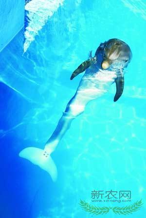 据美国媒体5日报道,海豚“温特”在2005年因被捕蟹网缠住,痛失尾鳍。为了帮助“温特”正常生活,当地水族馆请来世界顶尖义肢专家,为它量身定做了一条独特的“义鳍”。经过一年多努力,“温特”终于在去年8月装上用硅胶和塑料制作的“义鳍”,并因此成为世界上首例安装完整仿生肢体的海洋动物。目前“续尾”的温特已能像正常海豚一样畅游。