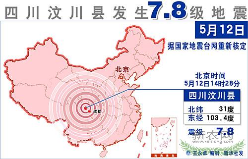 据国家地震台网重新核定,北京时间5月12日14时28分,在四川汶川县(北纬31度,东经103.4度)发生的地震震级为7.8级。