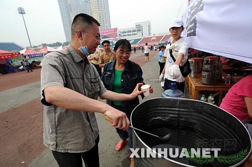 5月20日早晨,志愿人员为受灾群众盛防止腹泻的中药水。新华社记者杨磊摄