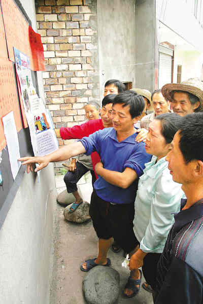 28日,四川雅安县雨城区合江镇受灾群众在看救济粮补助金发放公示牌。记者张悦摄