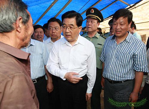 5月31日,中共中央总书记、国家主席、中央军委主席胡锦涛前往陕西地震重灾区汉中市,察看灾情,指导抗震救灾工作。这是胡锦涛在宁强县广坪镇金山寺村同受灾群众亲切交谈。 新华社记者 鞠鹏 摄