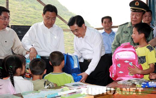 5月31日,中共中央总书记、国家主席、中央军委主席胡锦涛在陕西考察抗震救灾和恢复重建工作。这是胡锦涛到宁强县广坪镇金山寺村一个简易防震棚,向灾区少年儿童祝贺节日并赠送学习用品。 新华社记者 鞠鹏 摄