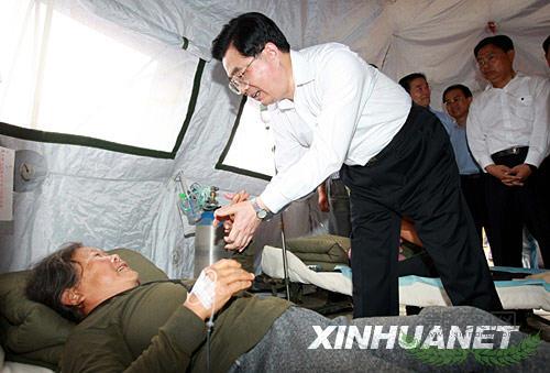 5月31日,中共中央总书记、国家主席、中央军委主席胡锦涛前往陕西地震重灾区汉中市,察看灾情,指导抗震救灾工作。这是胡锦涛在宁强县广坪镇金山寺村,看望正在救灾帐篷内接受治疗的受伤村民。 新华社记者 鞠鹏 摄