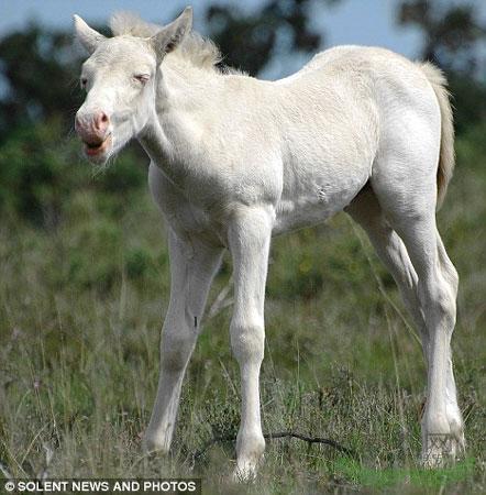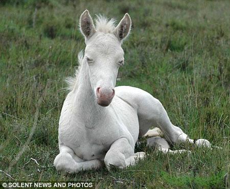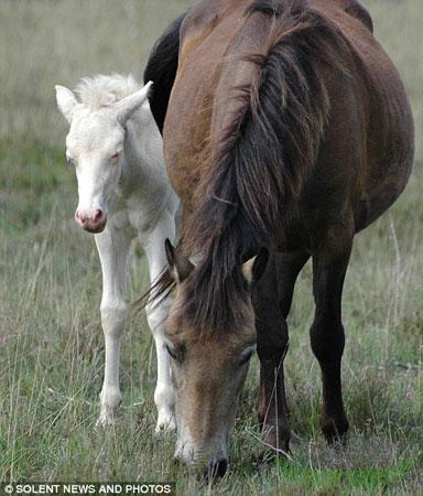 现在,这匹小马驹已成为新森林的最大明星,越来越多的人涌到这里,希望亲眼目睹它的庐山真面目。照片中的另一匹马是它的母亲,身体颜色要暗得多。最先发现这匹白马的人认为,它可能得了白化病,但专家已排除了这种可能性。他们表示,这匹马的眼睛仍是蓝色的,如果真患有白化病,它的眼睛应该是粉红色的。除了蓝眼睛外,一些类似动物的皮毛和皮肤中还存在淡金色色素,而白化病动物只拥有白色这一种颜色。