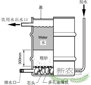 (3)对相对静止水体,如水库水、湖水、池塘水,可在岸边挖砂滤池过滤或向砂滤缸投加明矾后进行预沉淀;