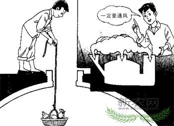 (4)检修沼气池时,要事先为池内通风,检修人员在入池前,还要先用活禽送入池内检测是否还有残留硫化氢或二氧化碳,防止中毒和窒息;