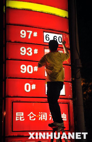 资料图片:6月20日凌晨,北京宣武门一处加油站的员工在更换油价牌。6月19日,国家发展和改革委员会宣布,自6月20日起将汽油、柴油价格每吨提高1000元,航空煤油价格每吨提高1500元,液化气、天然气价格不作调整。新华社记者罗晓光摄(记者江国成)