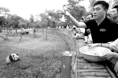 昨日,在上海野生动物园,台北市长郝龙斌忍不住给大熊猫喂食。 晨报记者 殷立勤 现场图片