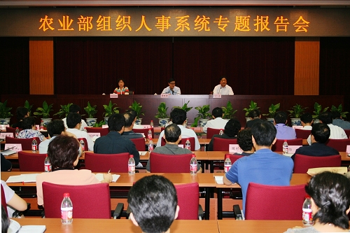 本网讯 为了迎接“七一”,配合“讲党性、重品行、作表率”树组工干部新形象活动的深入开展,6月25日下午,农业部组织人事系统开展了主题党日活动,邀请全国劳动模范、党的十六大和十七大代表、黑龙江省甘南县兴十四村党支部书记付华廷,河南省新乡市刘庄村史来贺同志事迹报告团成员、刘庄村村委会副主任刘俊荣作报告。部党组成员、人事劳动司司长梁田庚主持了报告会。部机关各司局、部属各单位组织人事干部共210多人参加了报告会。