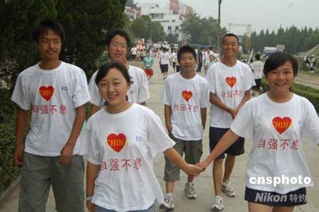 2008年7月3日下午,四川绵阳北川高考点,考生在完成第一天考试后走出考场。当日,受关注的北川935名考生顺利步入高考考场,在活动板房参加考试。中新社发 成和平 摄