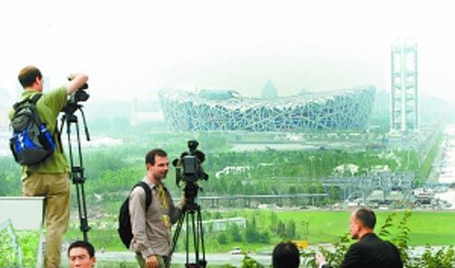 奥运绿化全部超额完成外国记者上午用镜头记录下美丽的奥运公园。北京晚报刘洁/摄