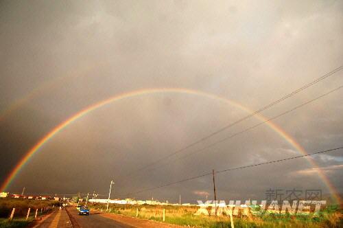当日晚7时30分左右,小雨过后,位于青海省海北藏族自治州的金银滩草原上空出现罕见双彩虹,颜色一深一浅,鲜艳夺目。新华社记者嘎玛摄