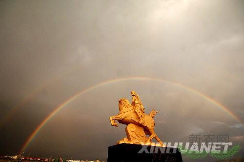 7月14日,绚丽彩虹挂在金银滩草原一处雕塑上空。新华社记者嘎玛摄