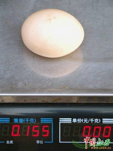 7月21日,记者在乐平市十里岗乡鲍家庄村民郑海发家拍摄到的巨无霸鸡蛋,其重量为155克。