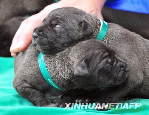 这5只克隆狗7月28日由2只代孕狗生产,黑色毛发,颈部下方有白色斑点。