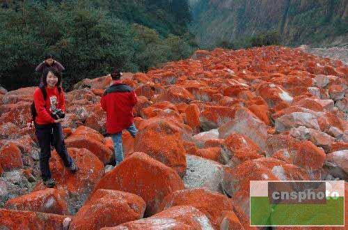 中新社甘孜磨西十月十八日电 (肖青 霍潺)面积达二百万平方米的罕见红石滩近日现身四川藏区燕子沟。据专家称,如此大规模的由地衣类植被附着而形成的红石滩非常罕见,堪称世界奇观。